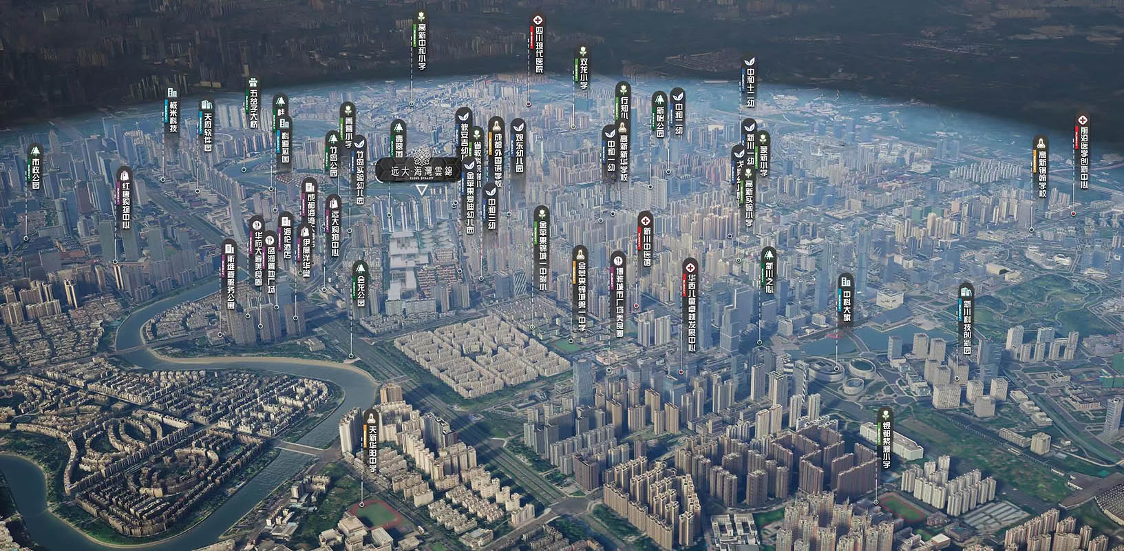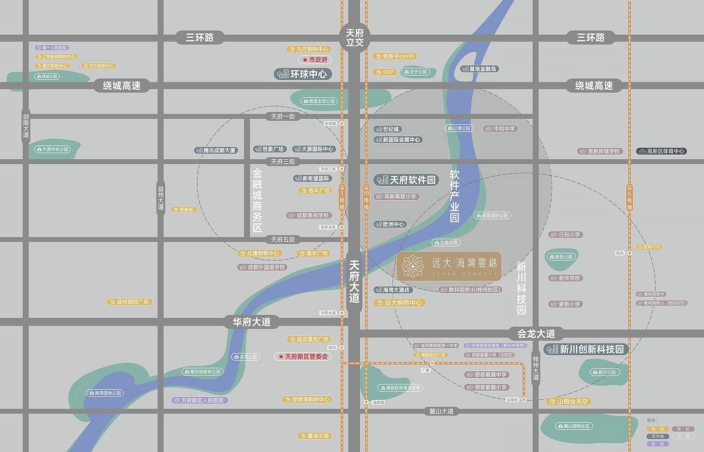 在成都,能背靠江、河、湖边的项目属实稀罕,而远大海湾云锦就是这稀罕住房中的一员。其楼下便是府河,推窗便可俯瞰滨江;周围一公里便有新怡公园、翡翠国际公园、桂龙公园等,都是周末遛娃、休闲的好去处。