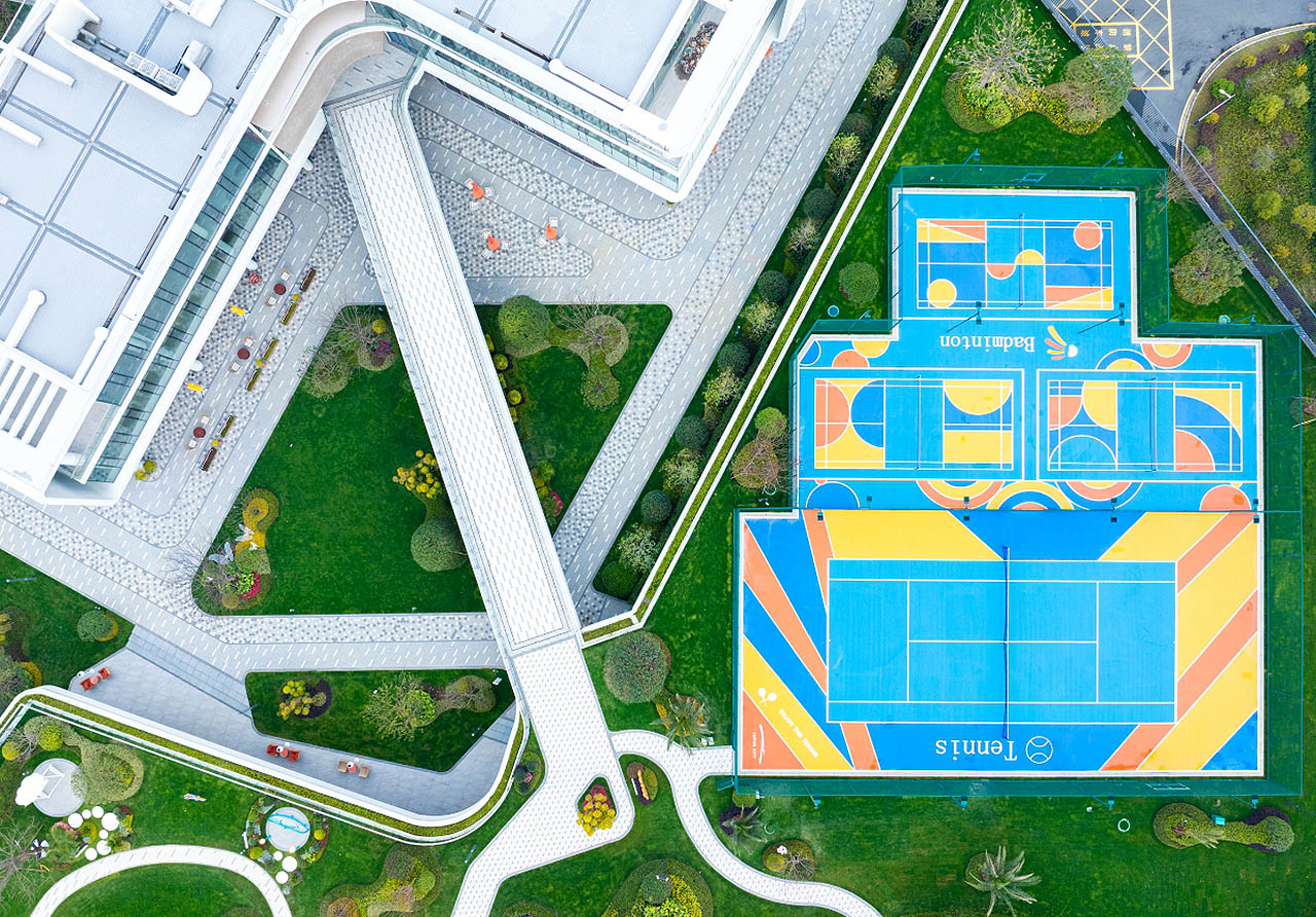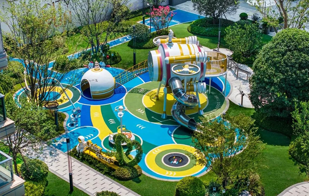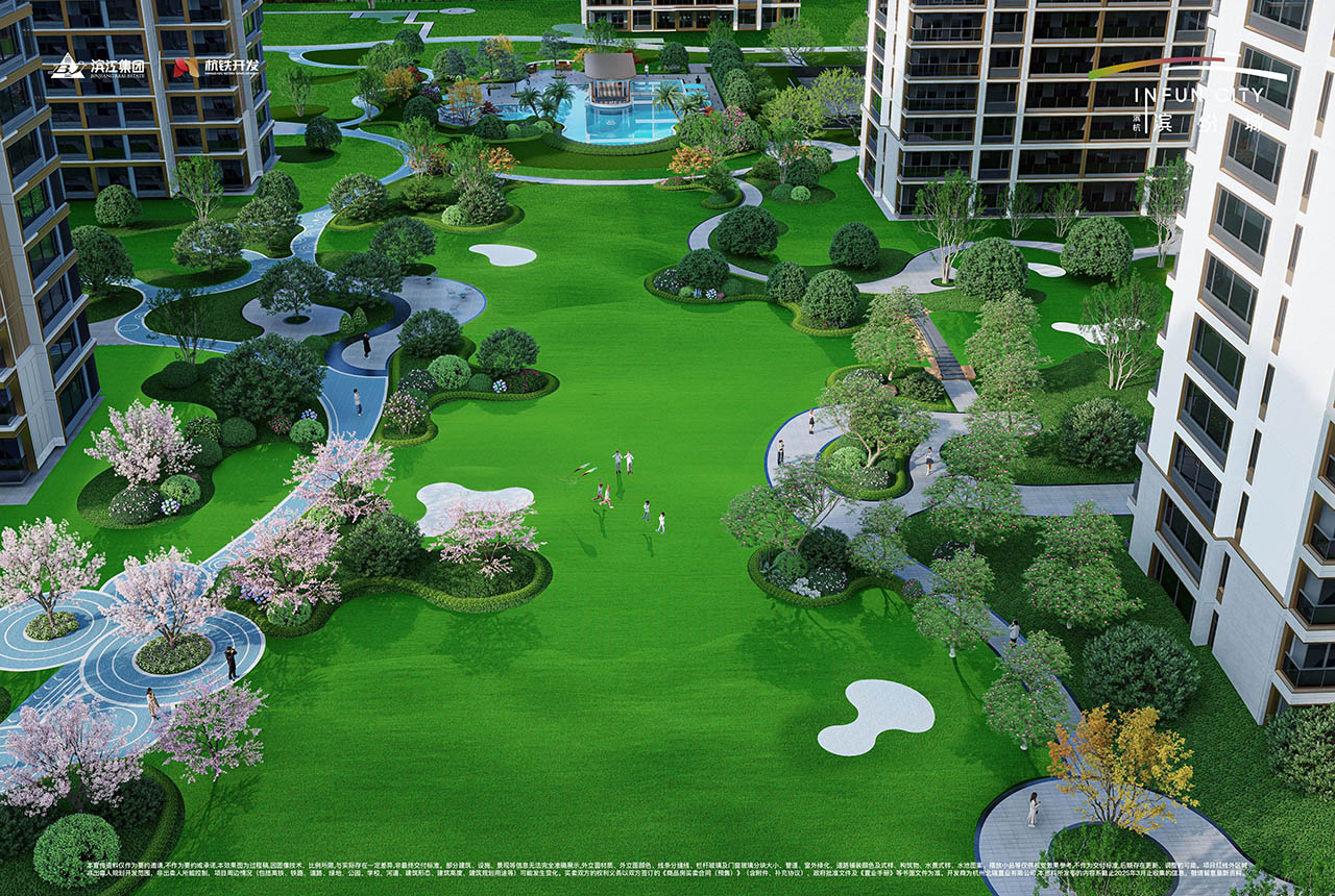 项目内打造约7万平方米一体化公园,以蓝宝石剧场为核心,构建一心三岛五进归家动线。规划篮球场、羽毛球场、轮滑广场、街式滑板场等15个运动场地,荧光广场、音乐阶梯、云上甲板、高线飞虹、海星聚场五大网红地标点缀其间。架空层打造阅读、共享厨房、儿童游乐等功能空间,内外交融创造楼下目的地,尽享诗意栖居。