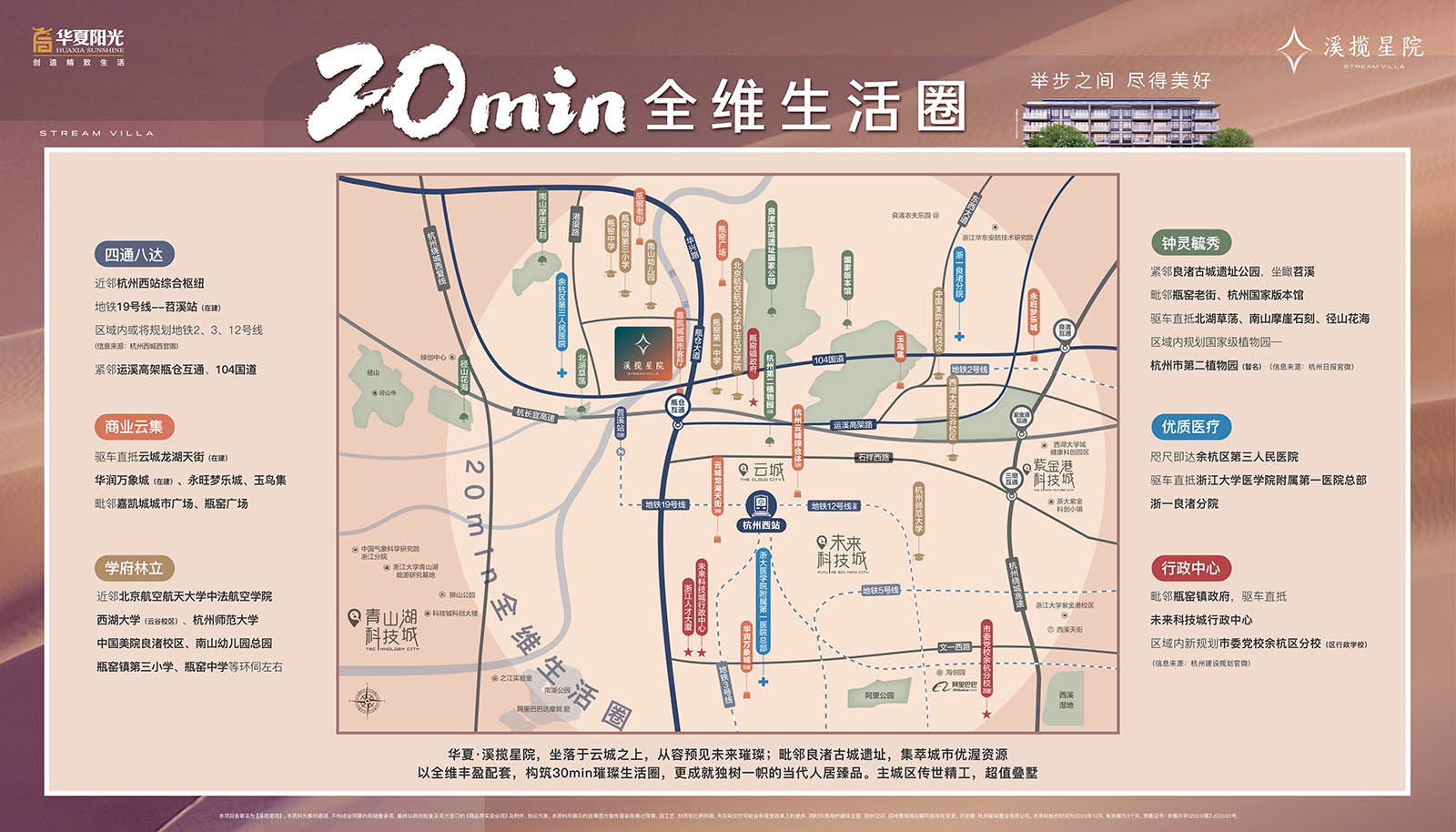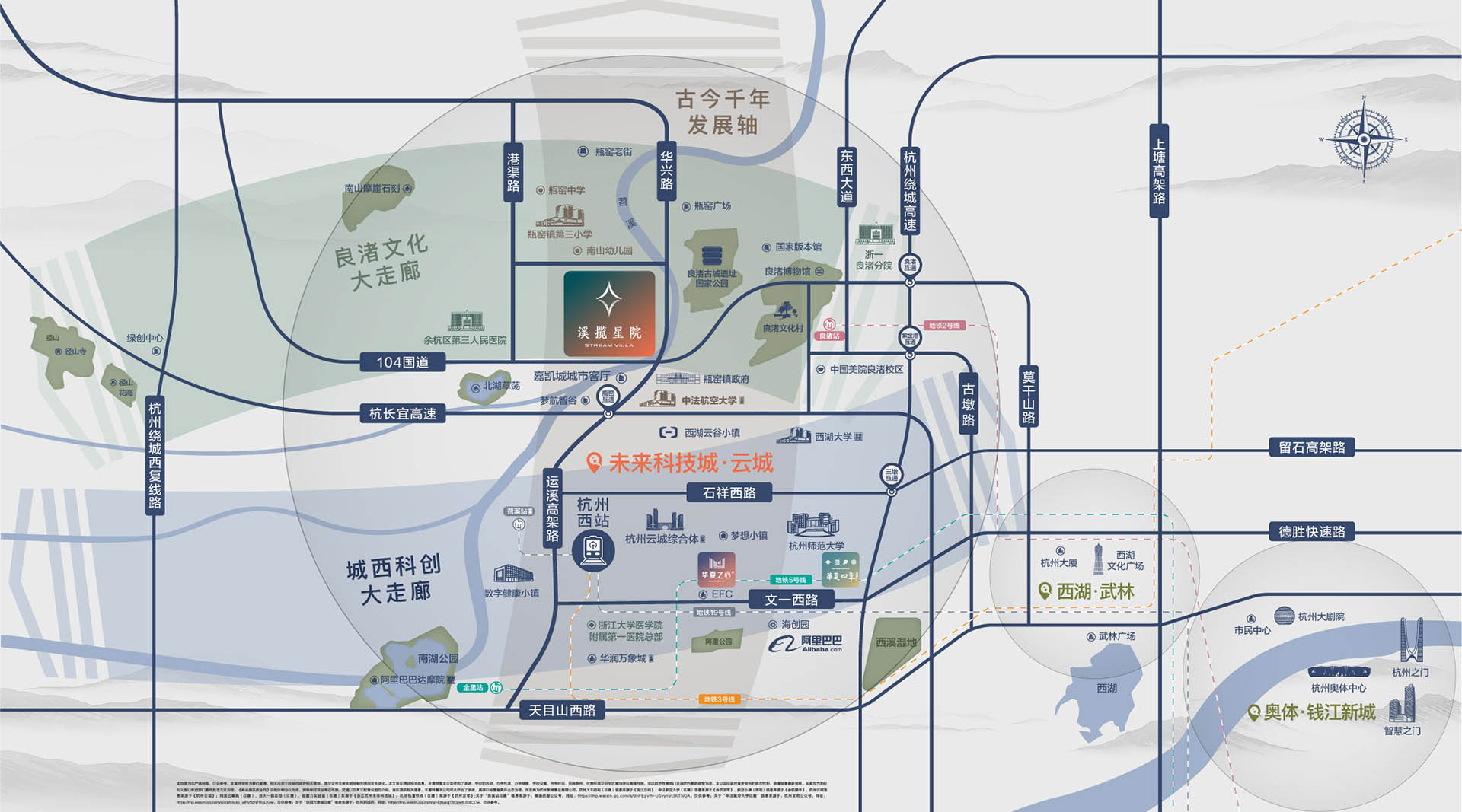 紧邻杭州西站综合交通枢纽,毗邻地铁19号线苕溪站(在建),运溪高架路、104国道、杭长宜高速等交通要道环伺。经西站约1小时畅达浙江全省,快速连接城西、未来科技城等核心区域,出行便利无忧。